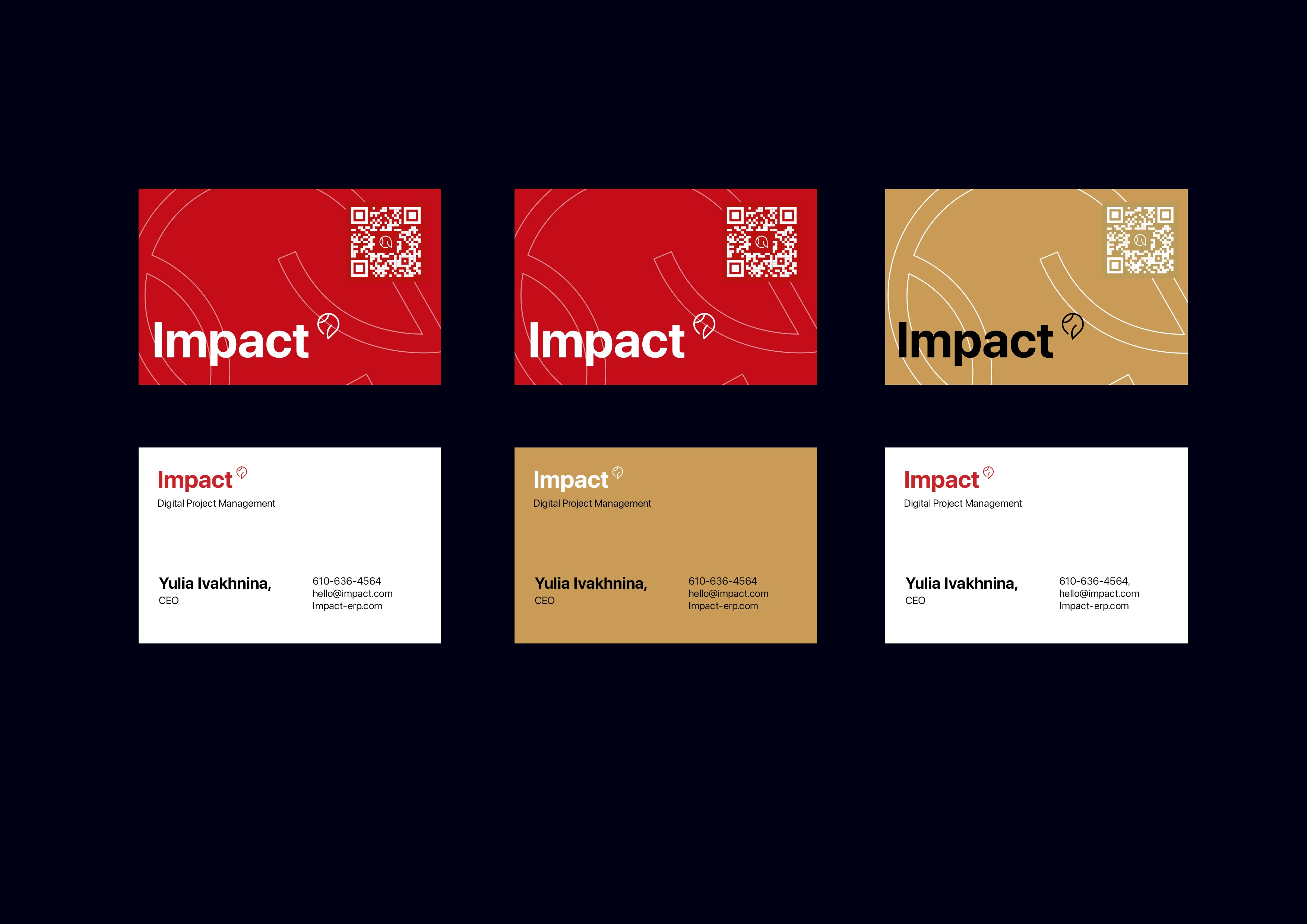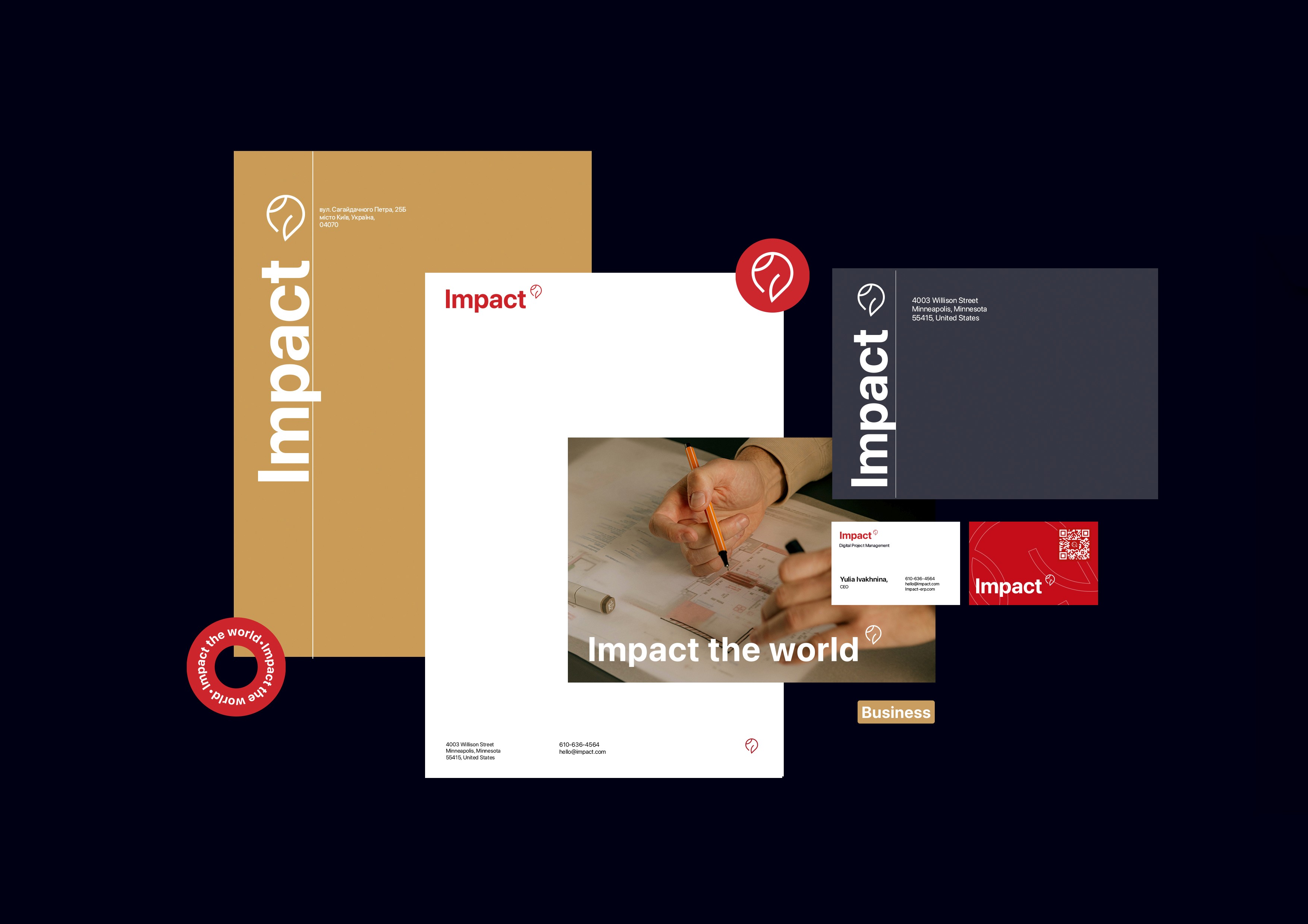 The brand identity for Impact features an abstract owl pointing upward, a symbol that embodies growth and progress. The dynamic identity also includes several logo options that are adaptable to a variety of media. The primary color scheme is vibrant red, complemented by craft and gray concrete hues that symbolize construction plans and the process of questioning and refining them.